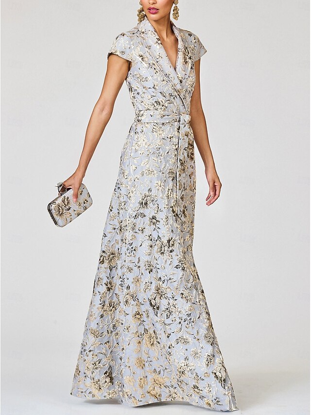 A-Line Mother of the Bride Cocktail Dresses Elegant Formal Dress Formal Wedding Floor Length Short Sleeve Lapel Pocket Nylon with Bow(s) Slit Pocket 1