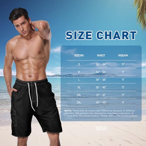 • [Mens Swim Trunks High Quality Fabric]:11 inch inseam .Made of polyester fabric. The fabric is fast drying,breathable, lightweight, and sun proof.Normally it takes 5 to 10 minutes, swim shorts have become dry already.Will bring you a cool summer.