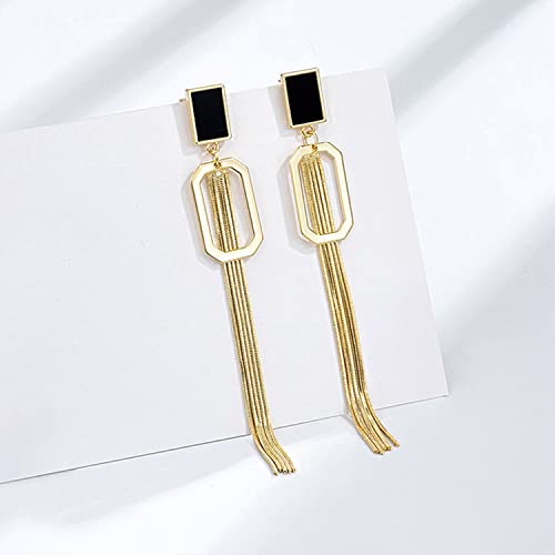 HOT ! Chic Gold Long Tassel Dangle Drop Earrings Unique Fashion Geometric Black Square Metal Chain Earrings Statement Jewelry for Woman Girls