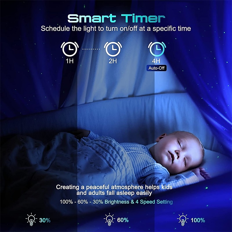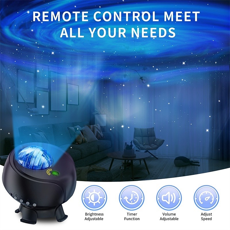 - Remote Control & Auto Off Timer: Take full control of the galaxy lights and starry night sky with the included remote control. Easily turn ON/OFF the lights, adjust brightness, lighting mode, speed, music, and volume. Additionally, the auto-off timer allows you to set the projector to turn off after 1 or 2 hours for convenience.