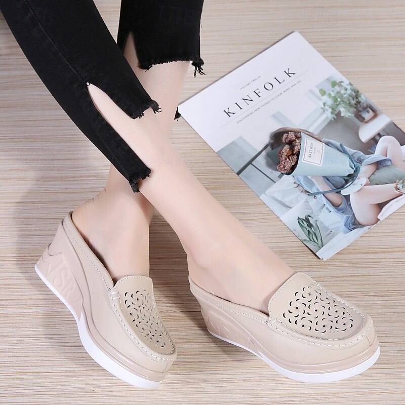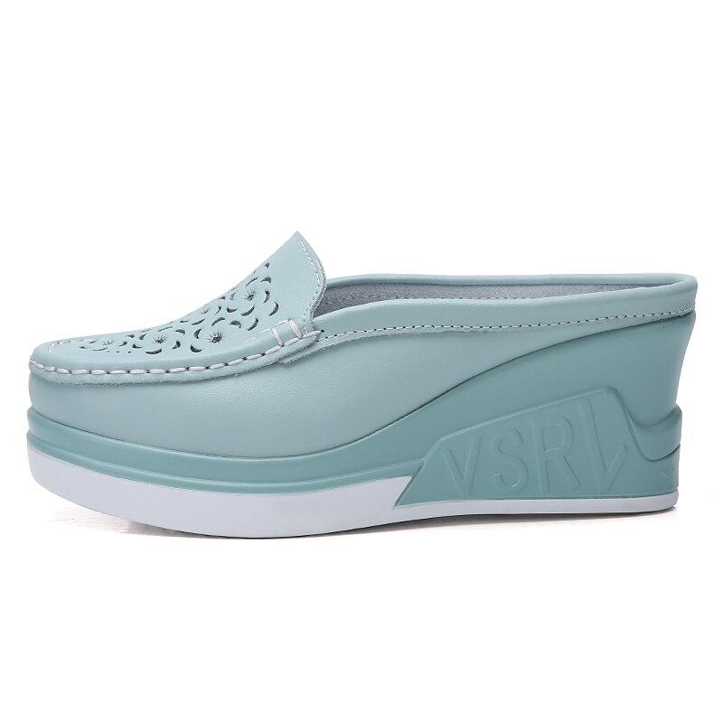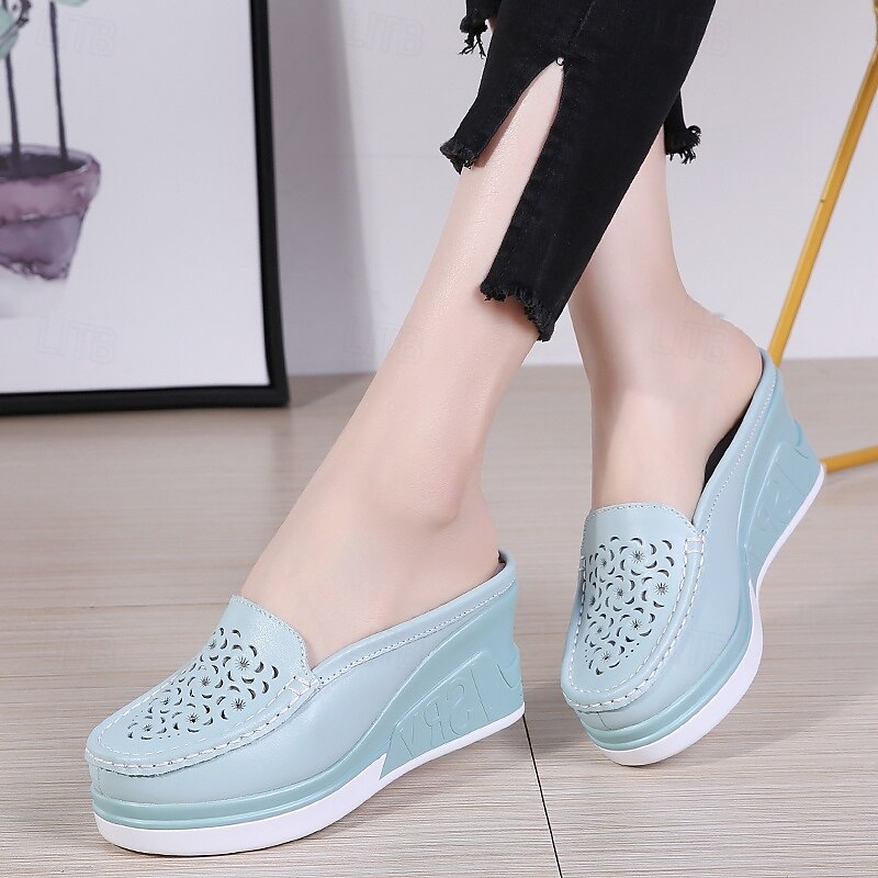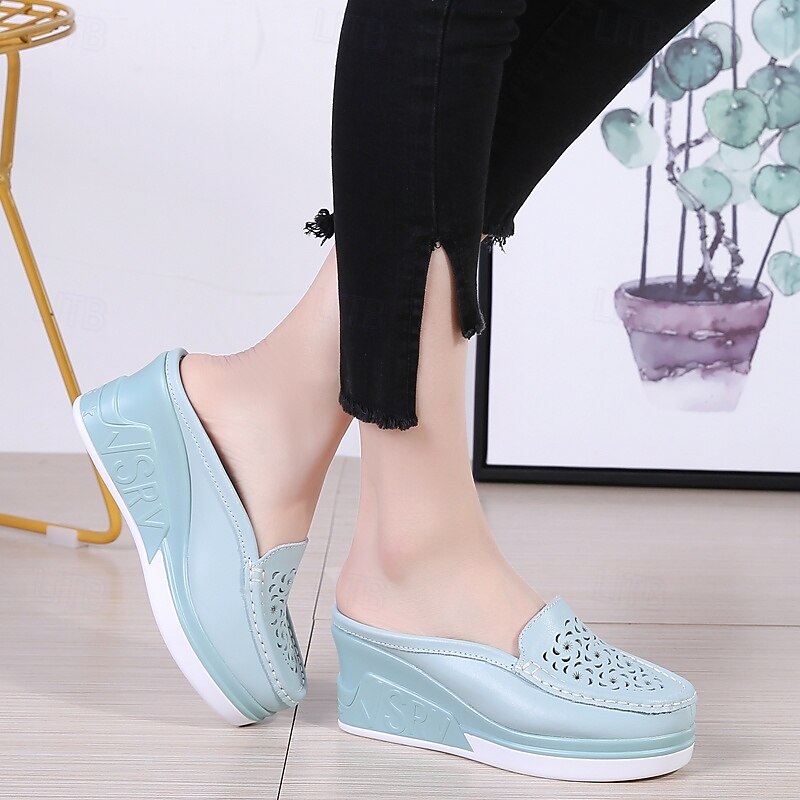 Highlights [Fabric & Construction] : Crafted with a premium PU (Polyurethane) upper, these Women's Platform Mules are designed for durability and a sleek, smooth finish. The lightweight blue hue adds a touch of modernity, while intricate laser-cut floral patterns provide an elegant and feminine aesthetic. [Style & Fit] : These mules feature a platform design with a comfortable flat heel, providing a subtle lift while ensuring stability and ease of wear. The slip-on loafer style offers effortless convenience, making these shoes a great choice for women seeking both comfort and fashion. [Design Highlights] : The round toe design and solid color scheme make these mules versatile and timeless. The addition of delicate floral laser cuts enhances their charm, making them stand out with a graceful and stylish touch. [Occasions] : Perfect for daily wear at home or casual outings, these platform mules blend seamlessly into semi-formal events as well. Their versatility makes them suitable for various occasions, offering a comfortable yet chic look. [Size Range] : Available in an extensive size range—UK Size 14.5 and EU Size 50—these mules cater to diverse needs. Choose from classic colors such as White, Black, Beige, and Blue in sizes 36 to 40 to find your perfect fit.
