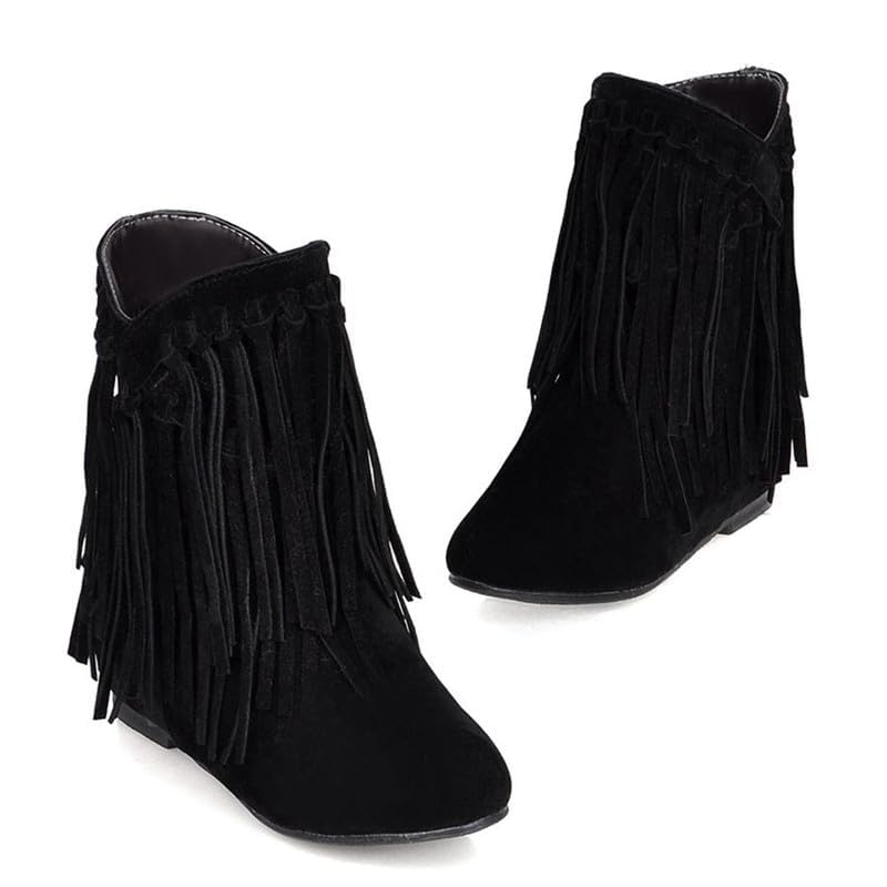 Womens Ankle Fringe Boots Round Toe WinterWide Calf Flat Tassel Moccasin Boots Casual Hidden Wedge Low Heel Ankle Boots 6