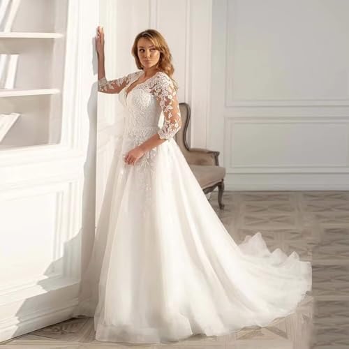 HOT ! Women’s A-line Plus Size Wedding Dress, Sheer Lace 3/4 Sleeves Wedding Dress for Brides