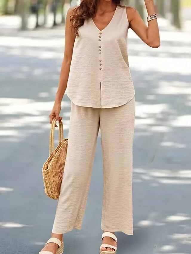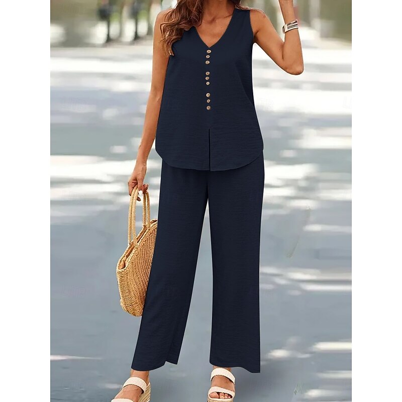 HOT ! Women's Fashion Streetwear Daily Pants Sets Sleeveless V Neck Plain Casual Daily Black Navy Blue Green Summer Loose Fit