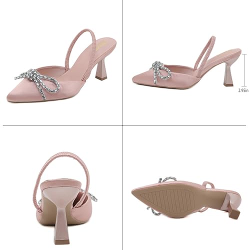 More information about Women's Satin Rhinestone Bow Kitten Heel Slingback Pumps Fashion Elastic Ankle Strap Closed Pointed Toe Heel Dress Shoes for Wedding Bridal Party Evening Prom