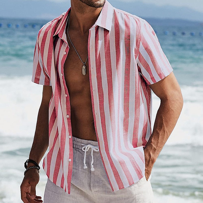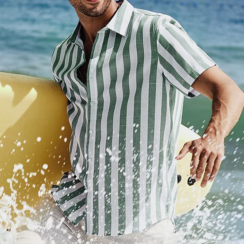 More information about Men's Shirt Summer Shirt Casual Shirt Beach Shirt Button Up Shirt Striped Shirts Black Pink Green Dark Blue Gray Short Sleeve Striped Lapel Vacation Street Print Clothing Apparel Polyester Fashion