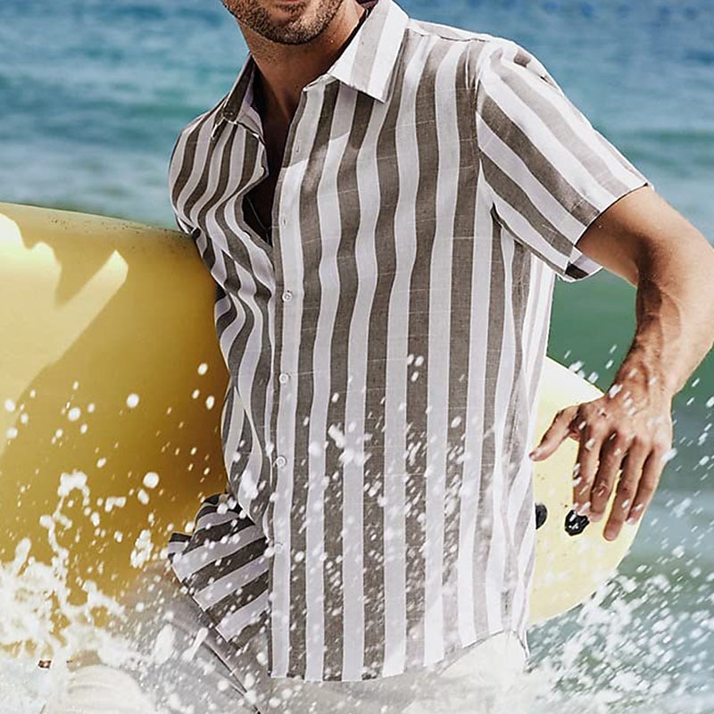 HOT ! Men's Shirt Summer Shirt Casual Shirt Beach Shirt Button Up Shirt Striped Shirts Black Pink Green Dark Blue Gray Short Sleeve Striped Lapel Vacation Street Print Clothing Apparel Polyester Fashion