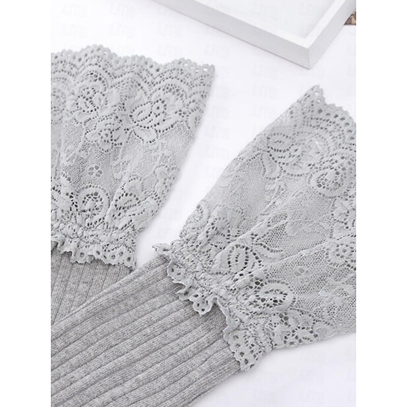 Highlights [Fabric]: Crafted from a breathable cotton blend, these women's stockings offer a soft ribbed texture that ensures comfort and warmth. The fabric combination provides enough elasticity for a snug fit, perfect for all-day wear. [Fit]: Featuring a versatile one-size design, these thigh-high socks are tailored to comfortably fit a range of body types. The elastic nature of the fabric allows for flexibility while maintaining their shape and position throughout the day. [Design Highlights]: These stockings are elegantly topped with a delicate lace trim, detailed with intricate floral patterns that enhance their vintage retro charm. The patchwork design adds a touch of sophistication and femininity, making them a stylish addition to any outfit. [Occasions]: Ideal for a variety of events, these stockings can be worn to weddings, at work, or for daily casual outings. Pair them with skirts, dresses, or shorts to elevate your style in the fall season while staying warm. [Size Range]: Available in one-size fits most, these stockings are designed to comfortably accommodate various leg shapes and sizes. The elastic material ensures a perfect fit without compromising comfort or style.