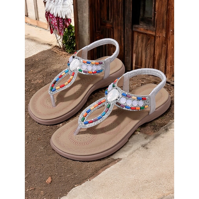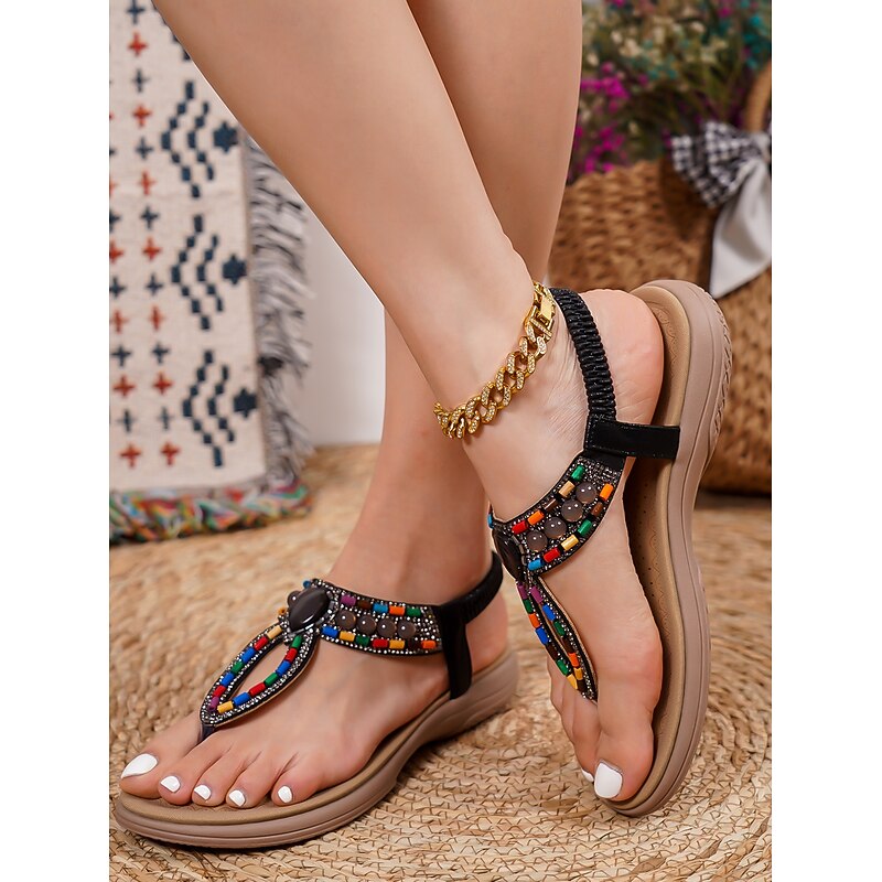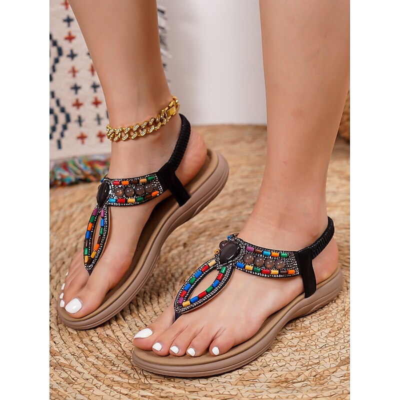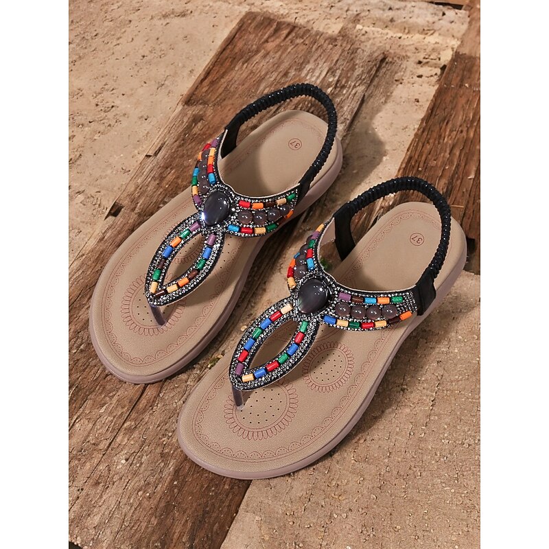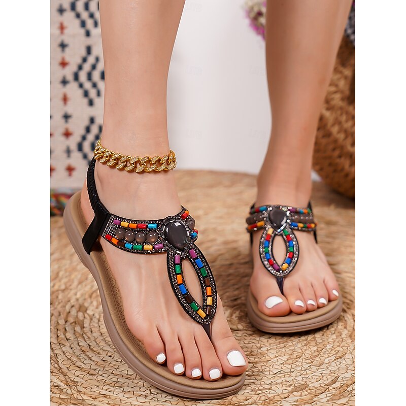 HOT ! Women's Bohemian Beaded Sandals – Colorful Rhinestone T-Strap Flat Sandals for Summer, Beach, and Casual Wear