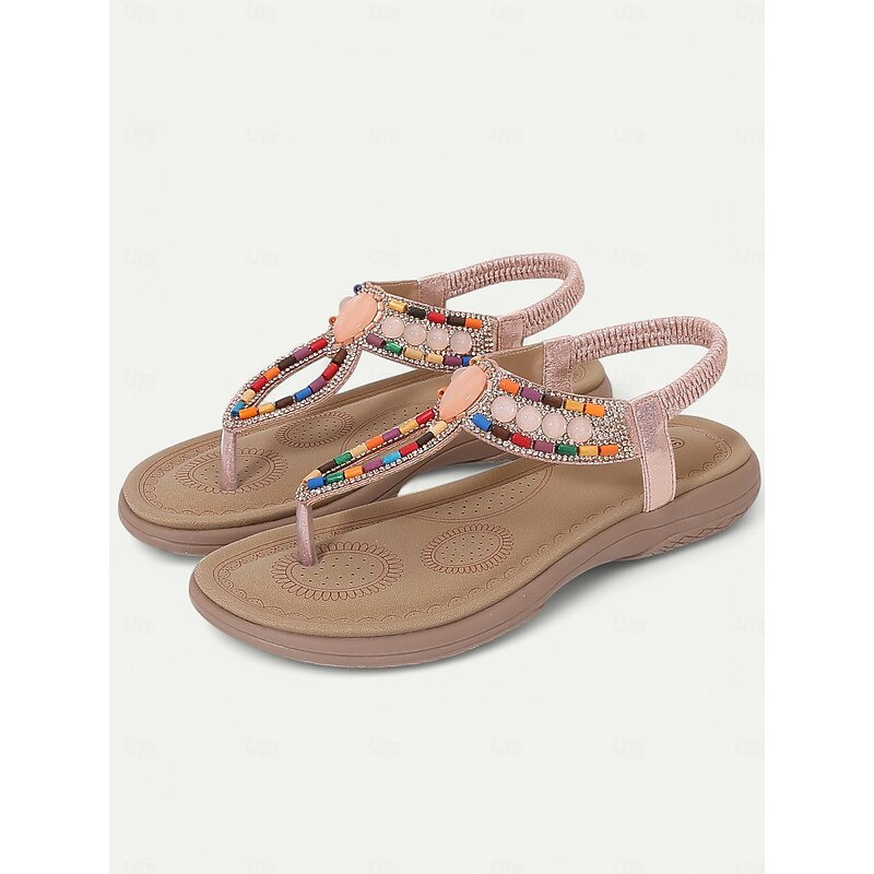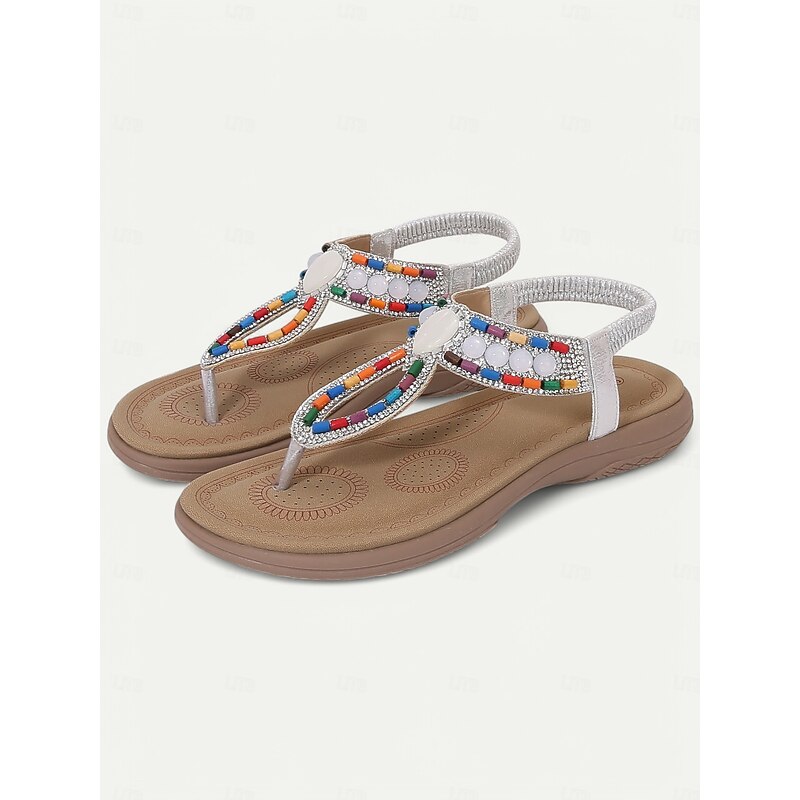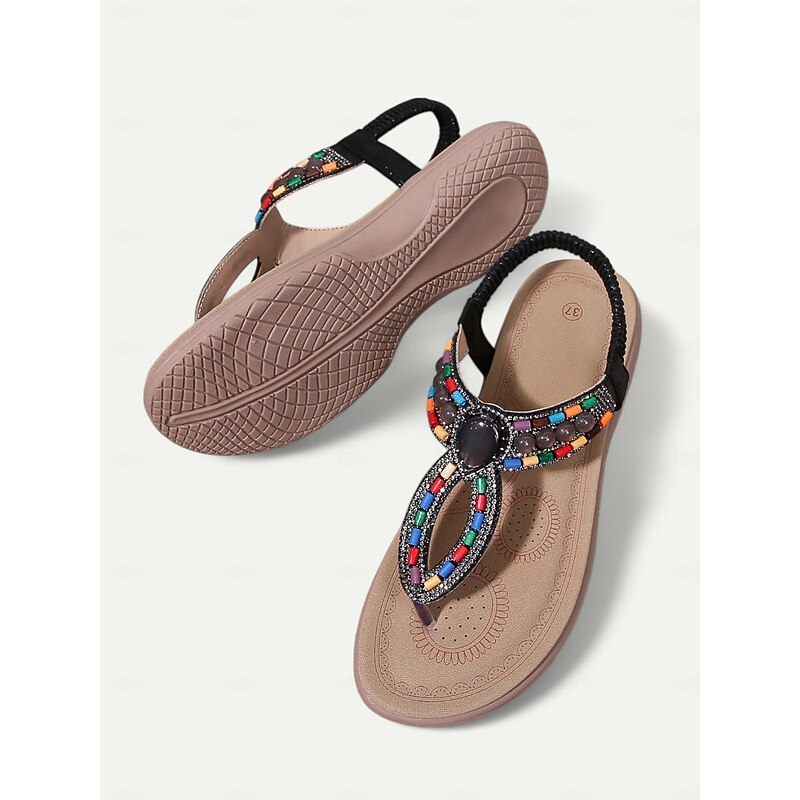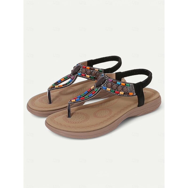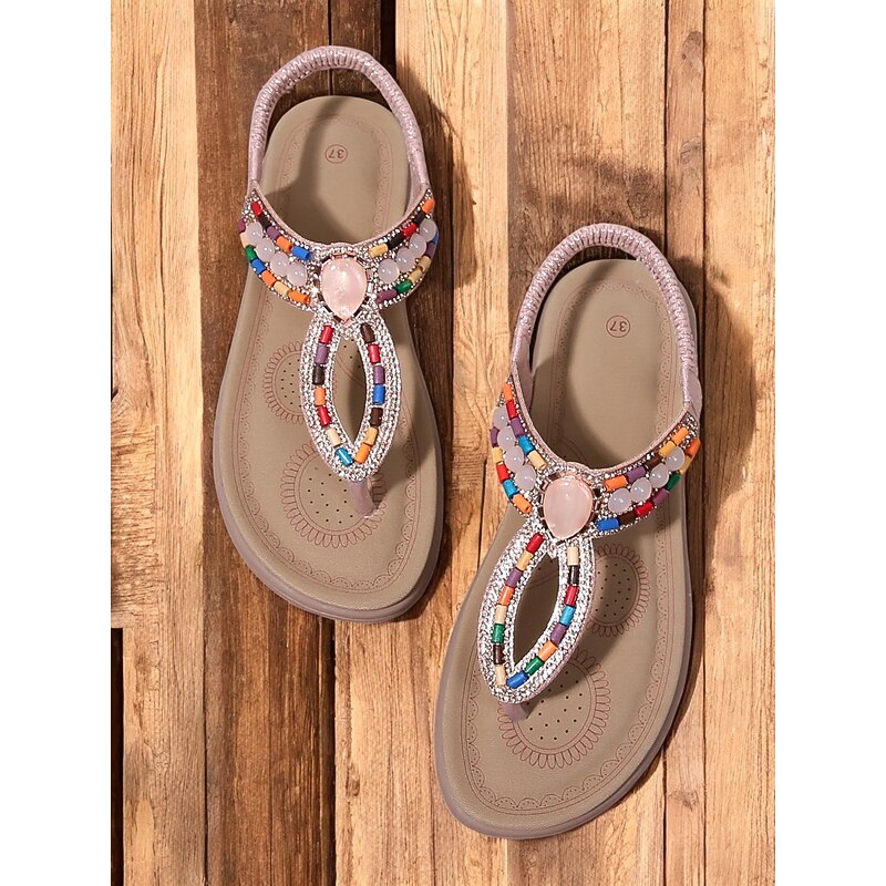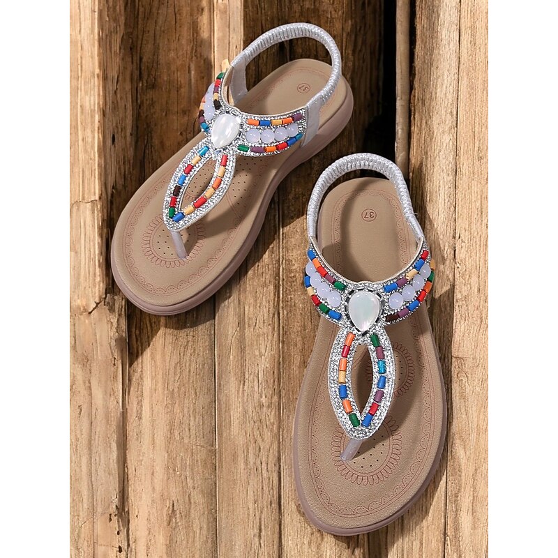 HOT ! Women's Bohemian Beaded Sandals – Colorful Rhinestone T-Strap Flat Sandals for Summer, Beach, and Casual Wear