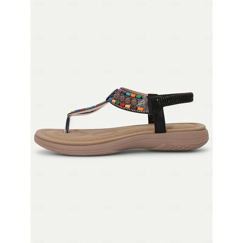 Women's Bohemian Beaded Sandals – Colorful Rhinestone T-Strap Flat Sandals for Summer, Beach, and Casual Wear 1