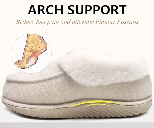 COFACE Women's Arch Support Memory Foam House Slippers Ladies Warm Fuzzy Faux Fur Collar Winter Moccasin Shoes with Orthotic Plantar Fasciitis Indoor Outdoor Hard Rubber Sole Beige Size 5 4