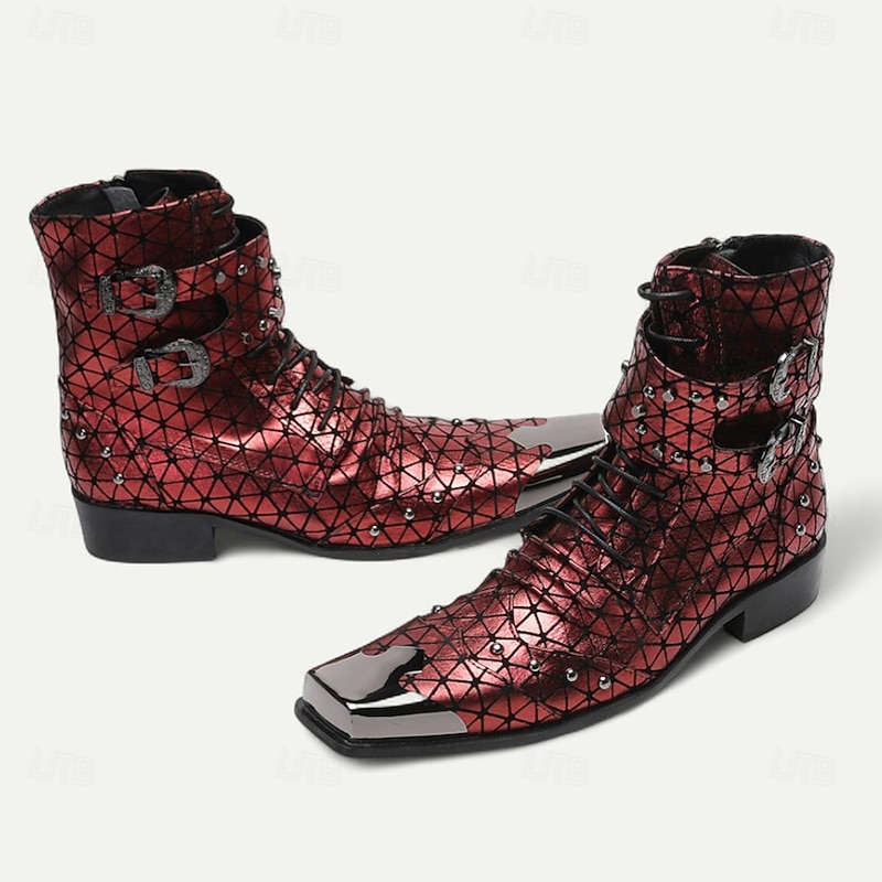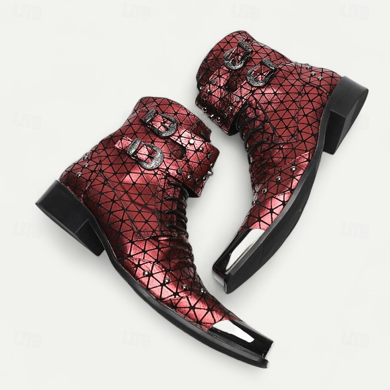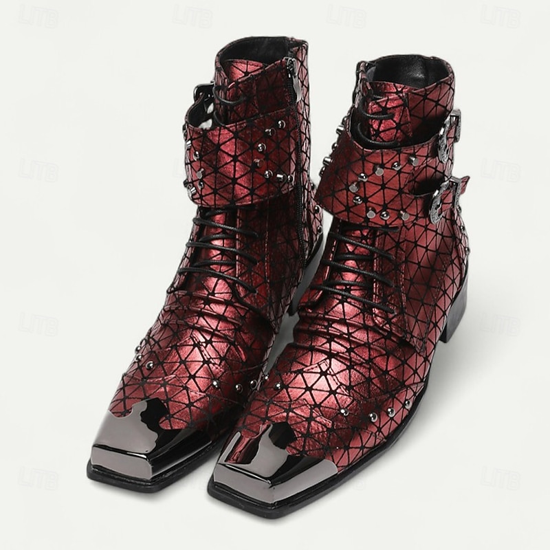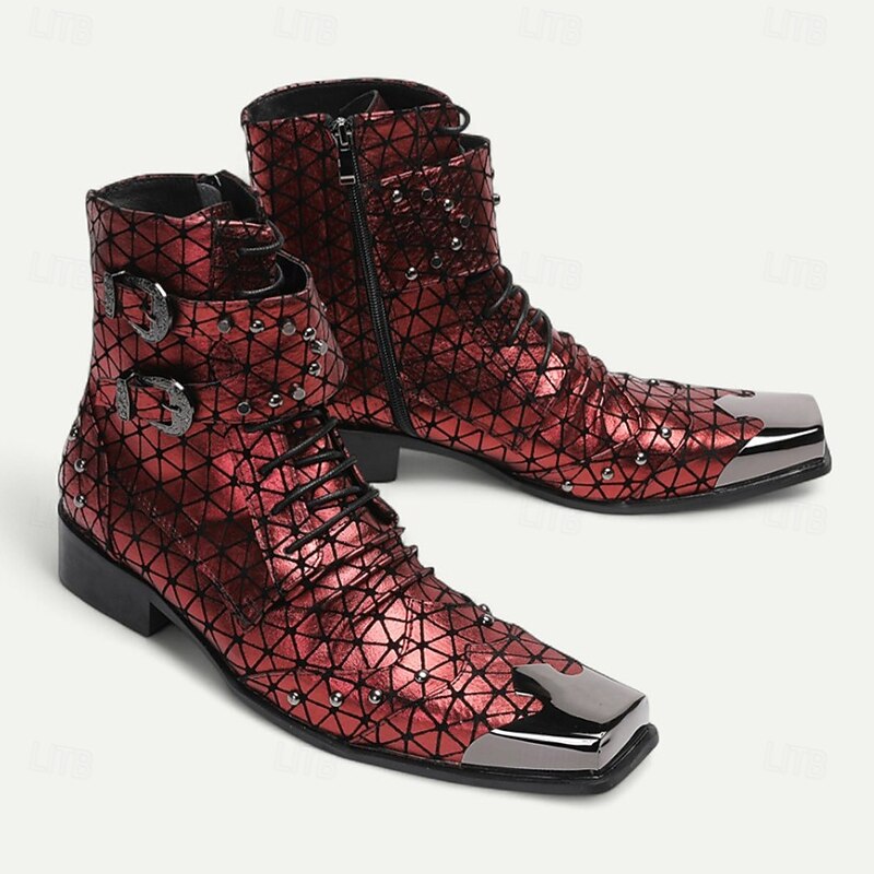 Men's Red Geometric Pattern Lace-Up Boots – Gothic Punk Pointed Toe Ankle Shoes for Concerts, Cosplay and Clubwear 1