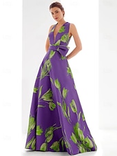 Highlights [Fabric] : This A-line evening gown is crafted from luxurious satin fabric, offering a smooth and silky texture that exudes elegance and sophistication. The fabric's vibrant purple color beautifully highlights the artistic green floral print, adding an element of charm and style. [Silhouette] : The dress features a classic A-line silhouette with a floor-length hemline that gracefully flows with every step. The deep V-neckline and sleeveless design create a flattering and confident silhouette, perfect for showcasing the shoulders and elongating the figure. [Design Highlights] : A standout feature of this gown is the large, eye-catching bow at the waist, which cinches the waistline and adds a touch of elegance and allure. The fitted bodice ensures a sleek appearance while transitioning seamlessly into a full, flowing skirt. [Occasions] : Ideal for formal events where making an impression is key, this gown is perfect for galas, weddings, red carpet events, and other special occasions. Its sophisticated design and luxurious fabric make it the perfect choice for an unforgettable evening. [Size Range] : Available in a wide range of sizes, from US 0 to US 26W, with the option for custom measurements, ensuring the perfect fit for any body type. Professional dry cleaning is recommended to maintain the gown's pristine condition and color vibrancy.