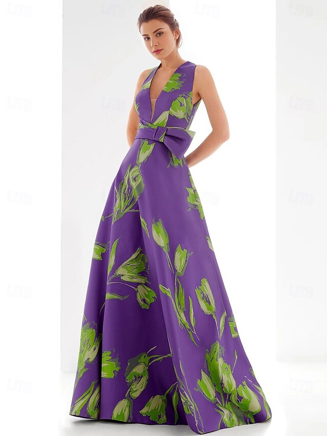 A-Line Evening Gown Elegant Dress Formal Floor Length Sleeveless V Neck Satin with Floral Print Bow(s) Wedding Guest Dress 1