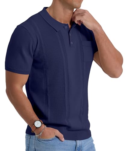 • Design: Men's knit golf shirt features a waffle textured design, short sleeves, a lapel collar, a chest pocket, and ribbed details. The classic fit and three-button placket give it a clean, retro look.