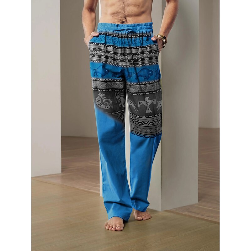 These pants stand out with a vibrant tribal-inspired graphic print featuring a unique cow theme, enhanced by color blocks in shades of blue, green, gray, and khaki. The mid-waist design is complemented by an elastic waistband with a functional drawstring, providing both flexibility and a secure fit. Additionally, front pockets add a practical touch for everyday use.