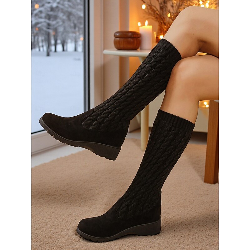 HOT ! Women's Black Knit Mid-Calf Winter Boots – Warm Slip-On Wedge Boots for Cold Weather and Casual Outfits