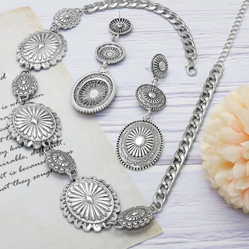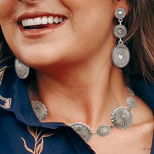 HOT ! 2 Pcs Concho Western Necklace Earrings Jewelry Set for Women Vintage Cowgirl Dangle Earrings Boho Choker Necklaces Western Country Concert Outfits for Women Concho Jewelry Gift