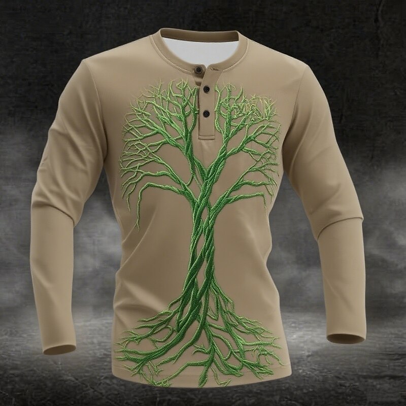 Men's Graphic Tree Henley Shirt Long Sleeve Fashion Cute Daily Casual Holiday Going out Spring &  Fall All Seasons Black Khaki Light Grey Henley Henley T-Shirt 1