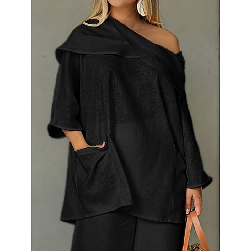 Highlights - Stay cool and comfortable all summer long with this cotton linen top - Versatile long sleeve design perfect for daily wear - Chic asymmetrical neckline adds a unique touch - Features a convenient pocket for added functionality - A basic style staple for every woman's wardrobe