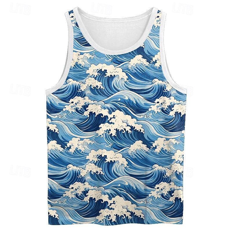 The tank top features a bold 3D graphic print that mimics abstract waves or scales in vibrant shades of blue, royal blue, and dark blue. It sports a classic crew neck and an eye-catching spray pattern, giving it a modern and stylish appeal.