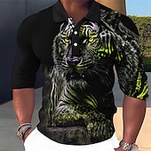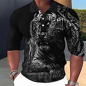 This polo shirt stands out with its eye-catching 3D tiger print, set against a primarily black background to emphasize the vibrant details. The bold, graphic design is complemented by the collared neckline and buttoned placket, delivering both style and functionality.