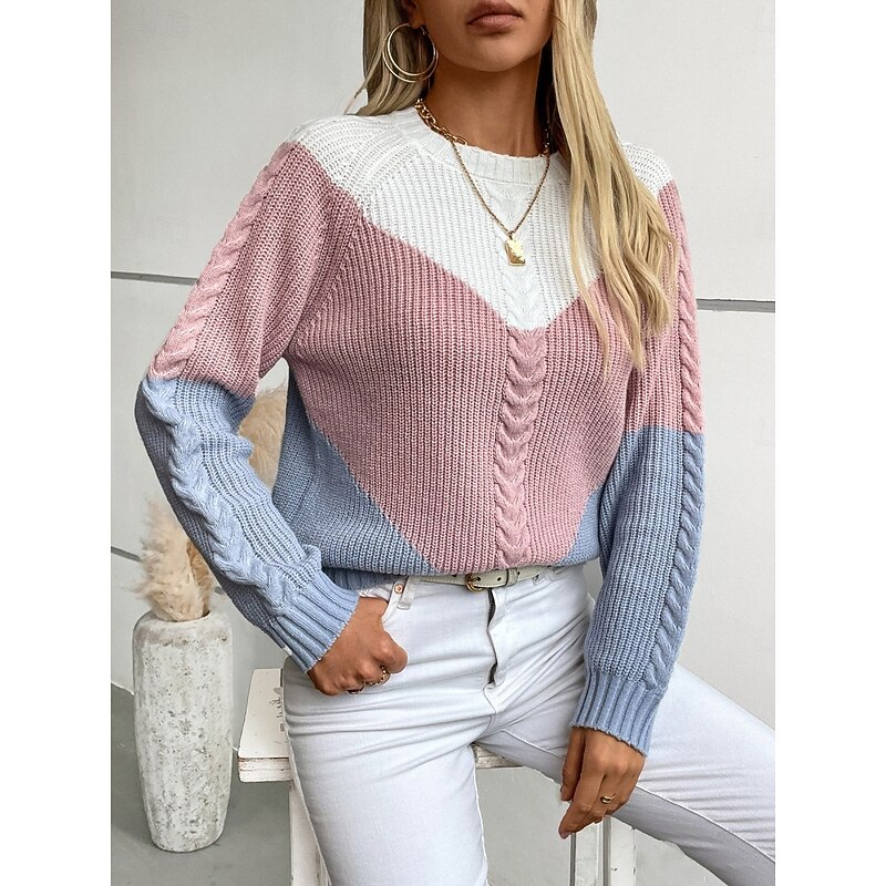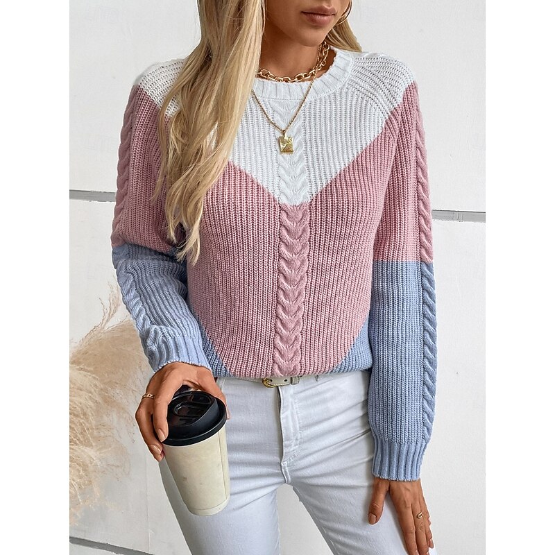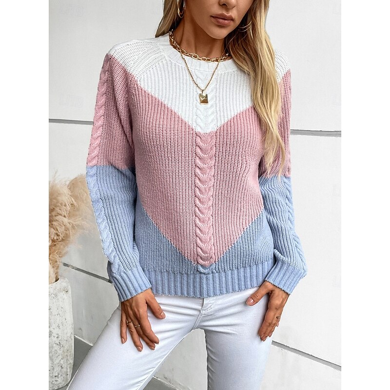 HOT ! Women's Sweater Casual Soft Color Block Ribbed Crew Neck Knitted Long Sleeve Regular Tops Knit Outdoor Daily Weekend Pink Blue Fall Winter