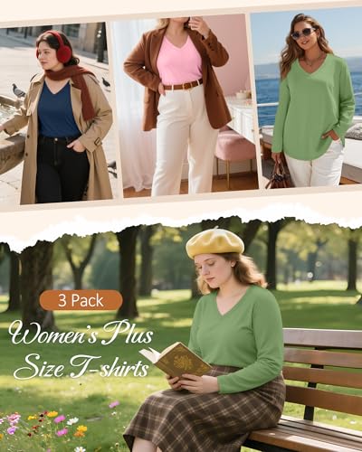 HOT ! Ficerd 3 Pack Women's Plus Size T-Shirts, V Neck Long Sleeve Blouse Shirts Loose Fit Curved Hem Tees Casual Swing Tunic Tops
