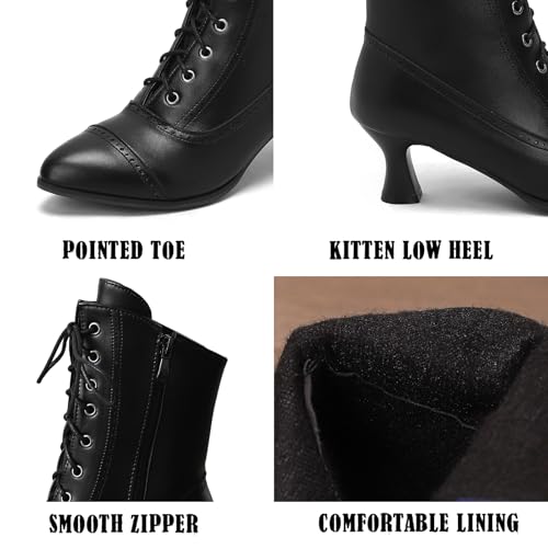 • 【Design】: This Victorian Lace Up Boots has a classic design,pointed toe,Kitten heel,make your matching clothes,skirts, and pants more matches.