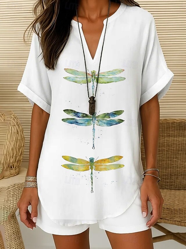 Women's Boho Shirt Graphic Animal Dragonfly Bohemia Vintage Daily Sleeveless Short Sleeve V Neck Regular Tops Daily Holiday Semi Formal White Light Green Royal Blue Blue Purple Summer Spring 2