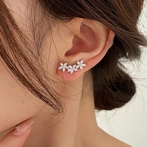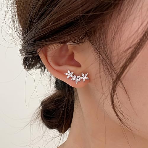 HOT ! Dainty Flower Stud Earrings for Women, 925 Sterling Silver Minimalist Sparkling Zircon Flowers Cluster Ear Climbing Earring for Bride Taecher Wedding Birthday Jewelry Gift
