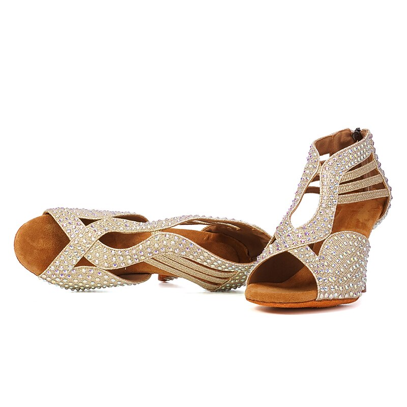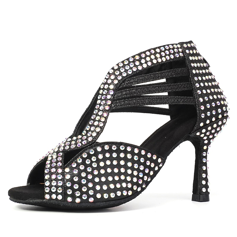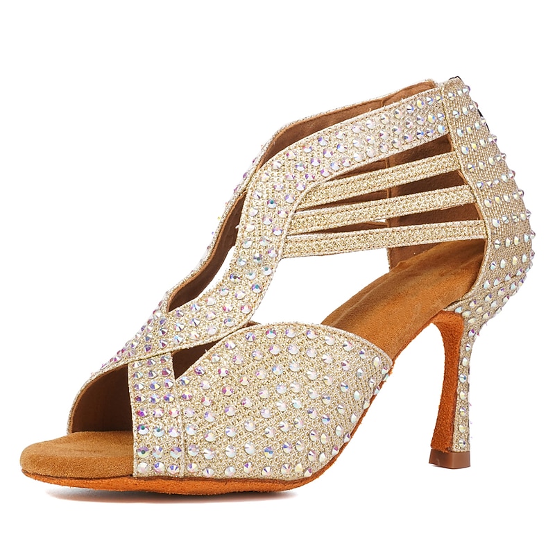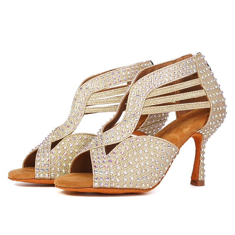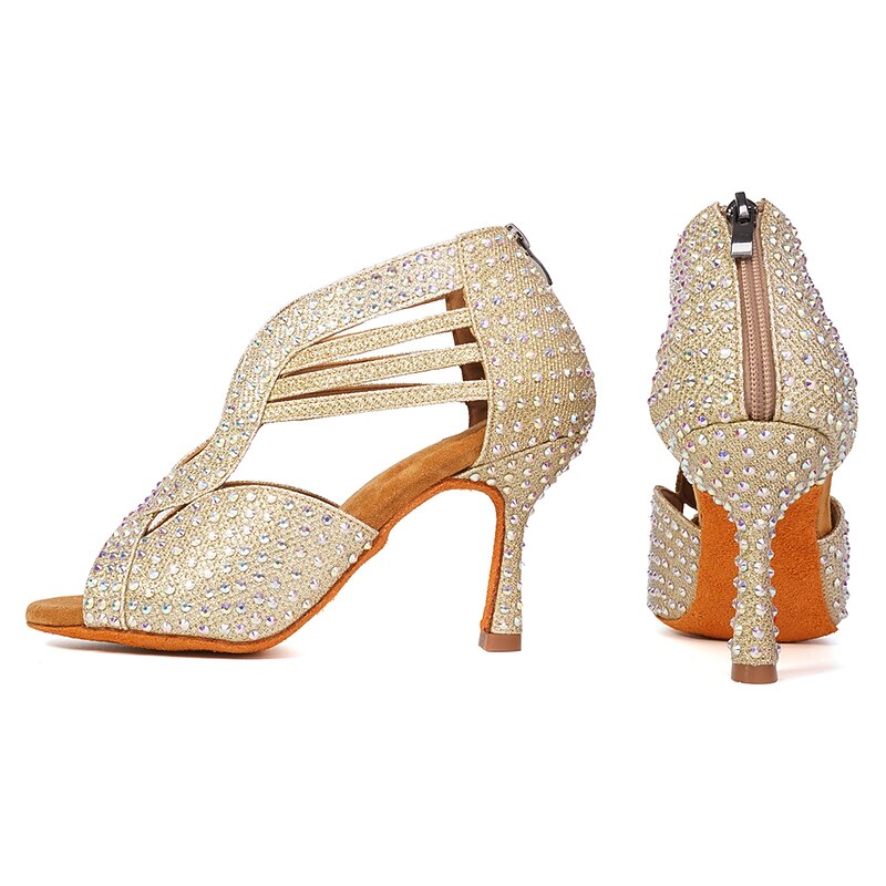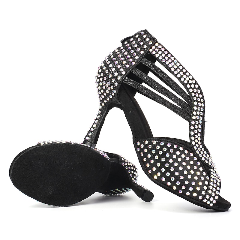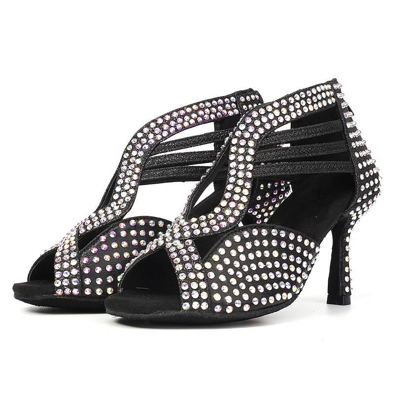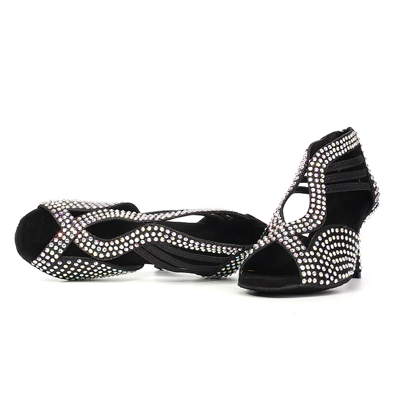 : These shoes feature an open-toe, strappy design that combines fashion with function. The flared heel, measuring at 3 to 4 inches, offers the perfect balance between height and stability, making them suitable for various dance styles.