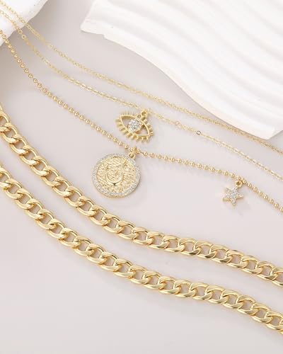 HOT ! MJartoria Gold Layered Necklaces for Women Trendy Retro Coin and Evil Eye Pendant Necklace Dainty Chunky Chain Choker Necklaces for Jewelry Birthday Gifts