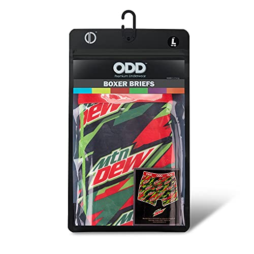 • Mountain Dew soda logo with a bold camo print in red and green; trendy and fun themed underwear for men; Be You, Be ODD