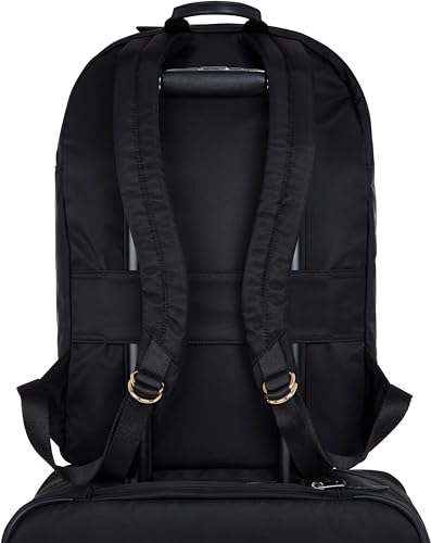 • Made from an elegant water resistant nylon exterior with brushed gold plated zippers and grain leather trim. Interior features a fully lined bright polyester lining that will stand up to daily use. This spacious womens business backpack keeps your computer separated from other work items and easily accessible on the go.