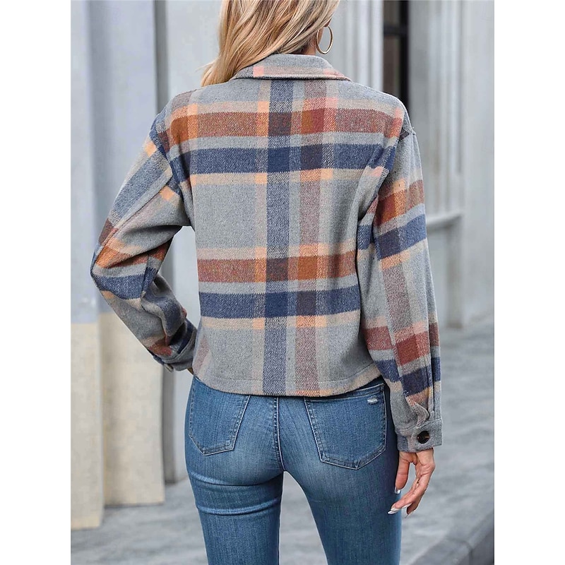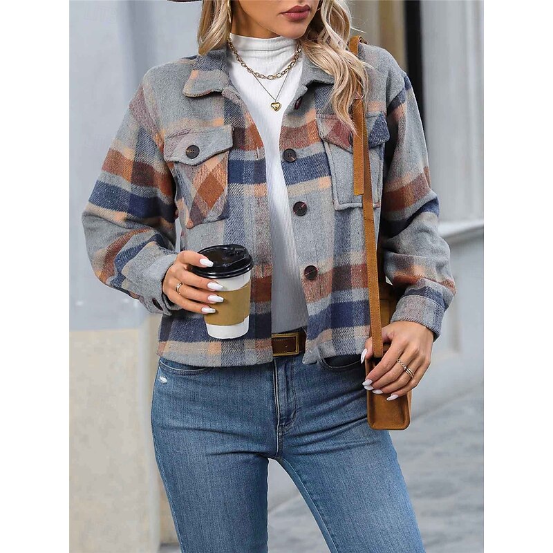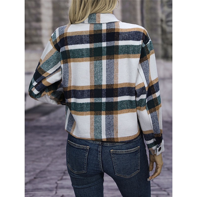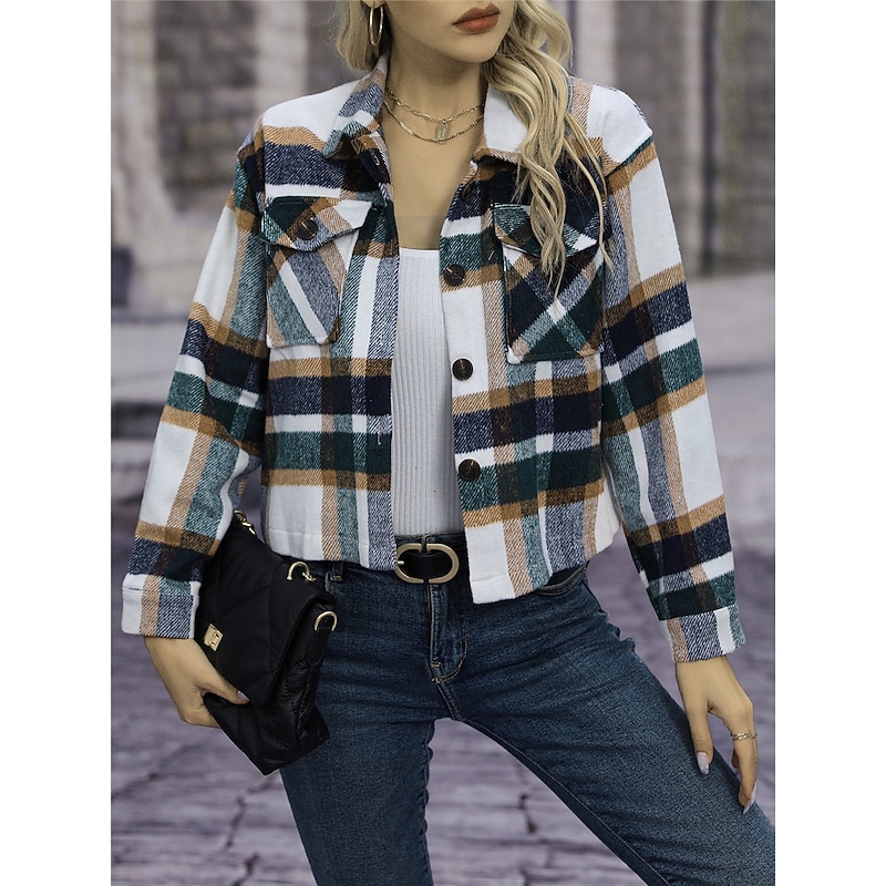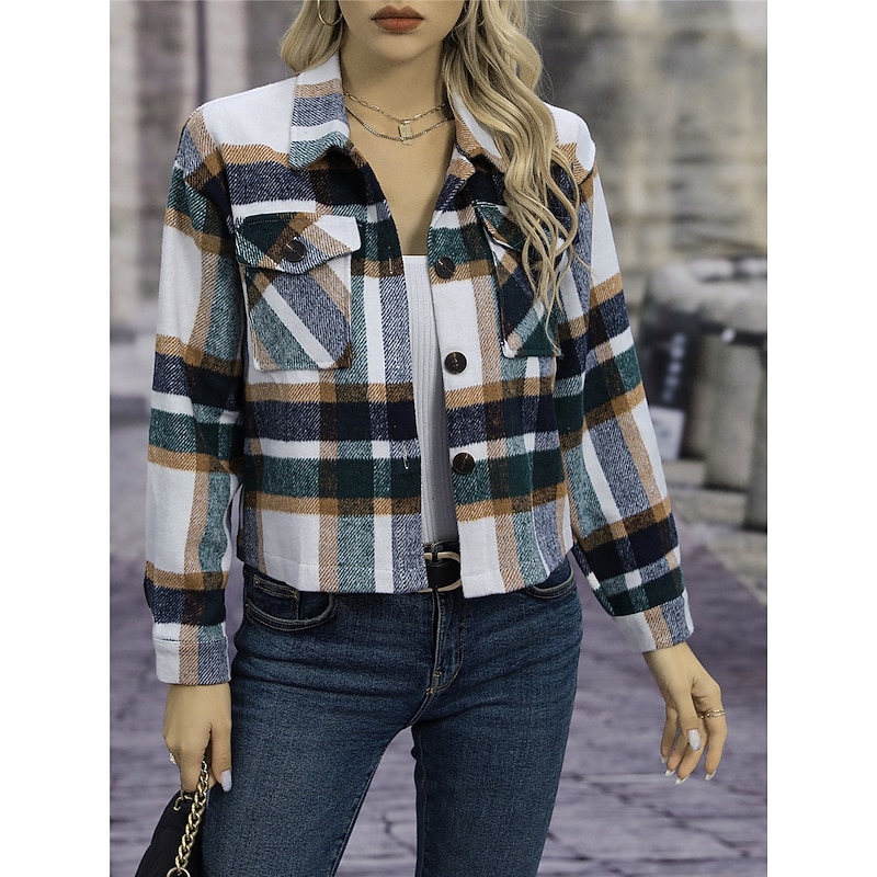 Highlights [Fabric] Crafted from high-quality polyester, this women's plaid jacket offers a micro-elastic fit that ensures both comfort and thermal warmth, making it an excellent choice for fall and winter wear. The fabric's breathable nature provides added comfort during outdoor activities. [Fit] Featuring a regular fit and a chic, cropped design, this jacket combines classic and modern elements. It is perfect for layering, providing a flattering silhouette that complements a variety of casual outfits. [Design Highlights] The jacket showcases a timeless plaid pattern with stripes, adding a touch of elegance to its casual style. It includes a single-breasted button-down front, turndown collar, and two buttoned chest pockets for enhanced functionality and style. [Occasions] Ideal for daily wear, this jacket is suited for street and outdoor settings. Whether you're heading out for a weekend stroll or a casual gathering, it provides a stylish and practical solution for cooler weather. [Size Range] Available in sizes S, M, L, XL, and 2XL, this jacket is designed to cater to a wide range of body types. Its versatile fit makes it a wardrobe staple for those seeking comfort and style in their outerwear choices. Perfect for everyday use. supreme materials and excellent craftsmanship ensure long-lasting durability.
