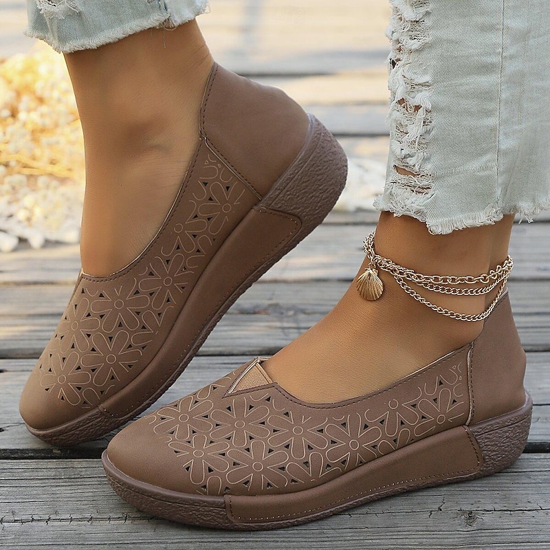 Highlights [Fabric] These women’s flat loafers are made from high-quality faux leather, providing both durability and a refined look for everyday wear. The material ensures a comfortable, breathable experience, perfect for all-day use during the spring and fall seasons. [Silhouette] Featuring a flat heel design, these loafers offer a relaxed and casual style, suitable for daily activities. The round toe shape provides ample room, ensuring comfort and ease for prolonged wear. [Design Highlights] The footwear is adorned with intricate floral cut-out patterns, adding an elegant touch to the casual shoe design. The slip-on style enhances convenience, making them ideal for quick dressing. The sturdy, textured rubber outsole provides excellent grip and support. [Occasions] Ideal for daily wear, these loafers are versatile enough to pair with jeans and other casual outfits. Whether running errands or enjoying a casual outing, they provide both style and functionality to complement your daily routine. [Size Range] Available in various sizes to accommodate different preferences, ranging from US6 to US10.5, ensuring a comfortable fit for a wide range of foot sizes.