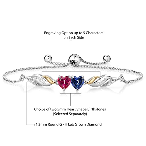 Gem Stone King 925 Sterling Silver and 10K Yellow Gold Customized and Personalized Name Engraved 2-Stone 5MM Heart Shape Gemstone Birthstone and White Lab Grown Diamond Tennis Bracelet For Women 2