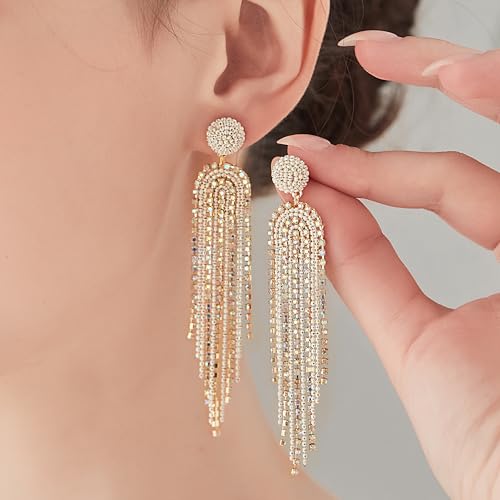 HOT ! Elegant Long Rhinestone Tassel Dangle Earrings for Women | 14K Gold Plated Chain Drop Earrings with 925 Sterling Silver Posts and Sparkling Cubic Zirconia - Statement Jewelry for Weddings