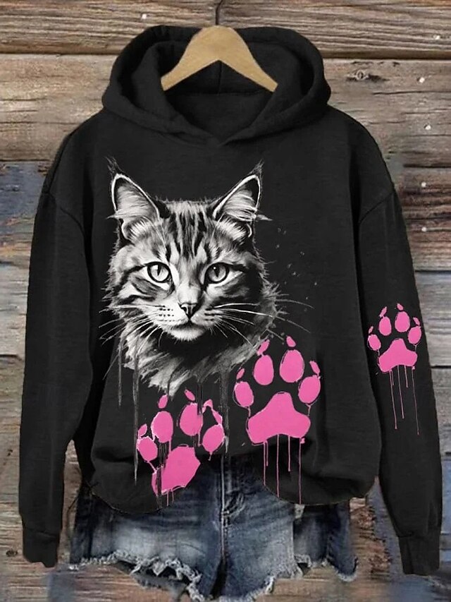 Women's Pullover Hoodie Sweatshirt Graphic Cat Elegant Warm Active Long Sleeve Hooded Regular Tops Street Dailywear Casual Print Black White Pink Blue Green Spring Fall Winter 13