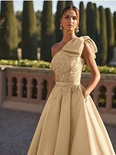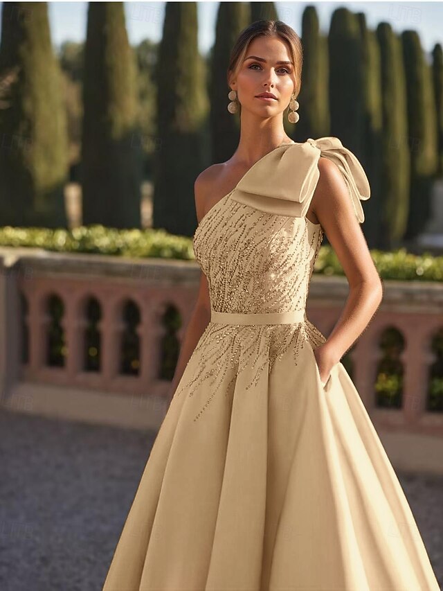 HOT ! A-Line Evening Gown Elegant Dress Formal Wedding Floor Length Sleeveless One Shoulder Satin with Glitter Bow(s) Beading