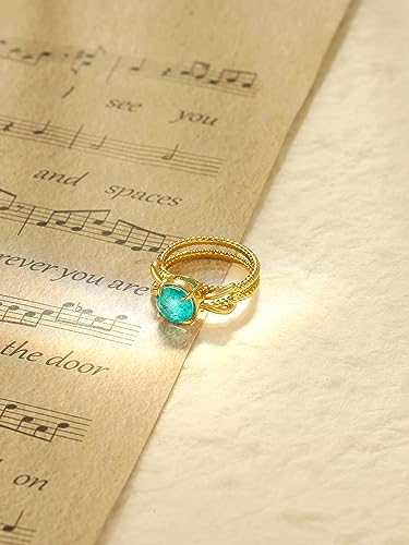 Gold Simulated Emerald/Paraiba Ring for Women Solitaire 8MM Round Cut 14K Gold Plated Minimalist Stack Knot Enhancer Guard Twisted Band Finger Jewelry Size 6-8 6