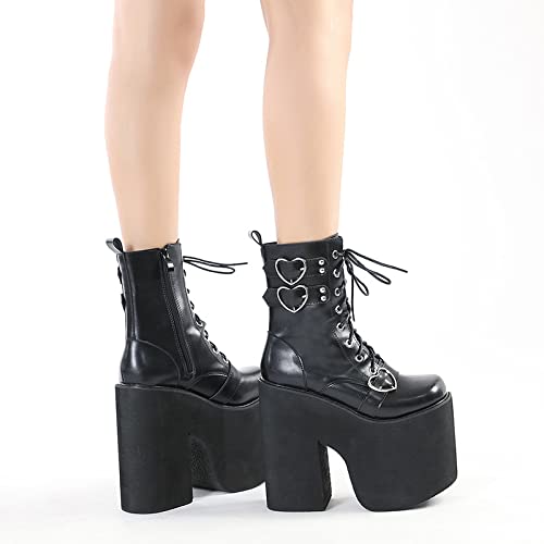 Women's black high heel goth chunky platform boots, gothic cosplay kawaii round toe combat boots, punk platform shoes 6