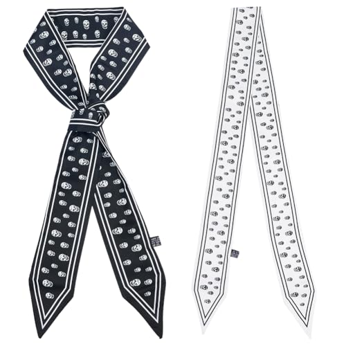 2Pcs 2 Colors Black White Skull Scarf Fashion Skeleton Pattern Neck Tie Neckerchief Versatile Handbag Handle Wrist Wrap Cover Skinny Soft Silk Headband Hair Head Scarves for Women Accessory 2