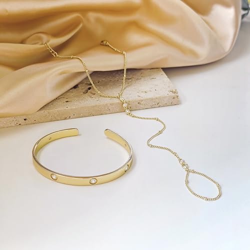 • Hand Chain Bracelet: Break ordinary bracelet designs by blending hand chain and ring elements to boost your style. Plus a gorgeous bangle bracelet, both inlaid with multiple round cubic zirconias. Wear alone or stack with other gold bracelets, an elegantly minimalist set.