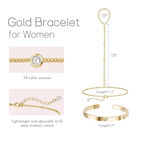 • Adjustable Bracelets: Gold bracelet with an inner circumference of 16.3cm and inner diameter approx. 2.23" × 1.93". Hand chain bracelet measures 7" with a 2" extender, fitting most women's wrist sizes. The inlaid gems are luxurious and sparkling, adding unique charm to daily outfits.