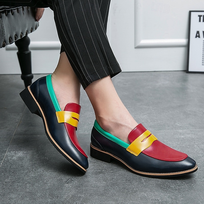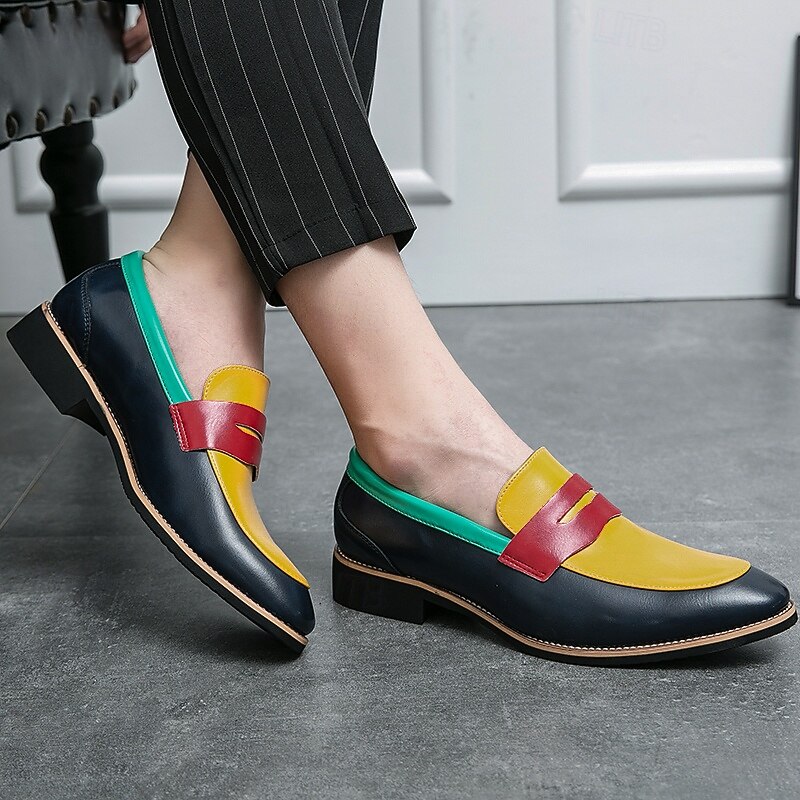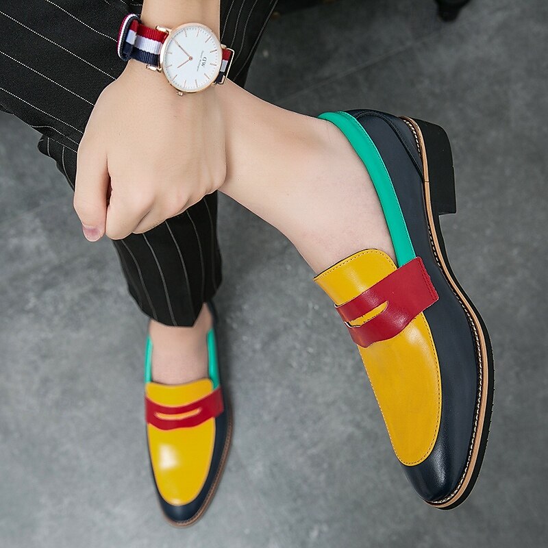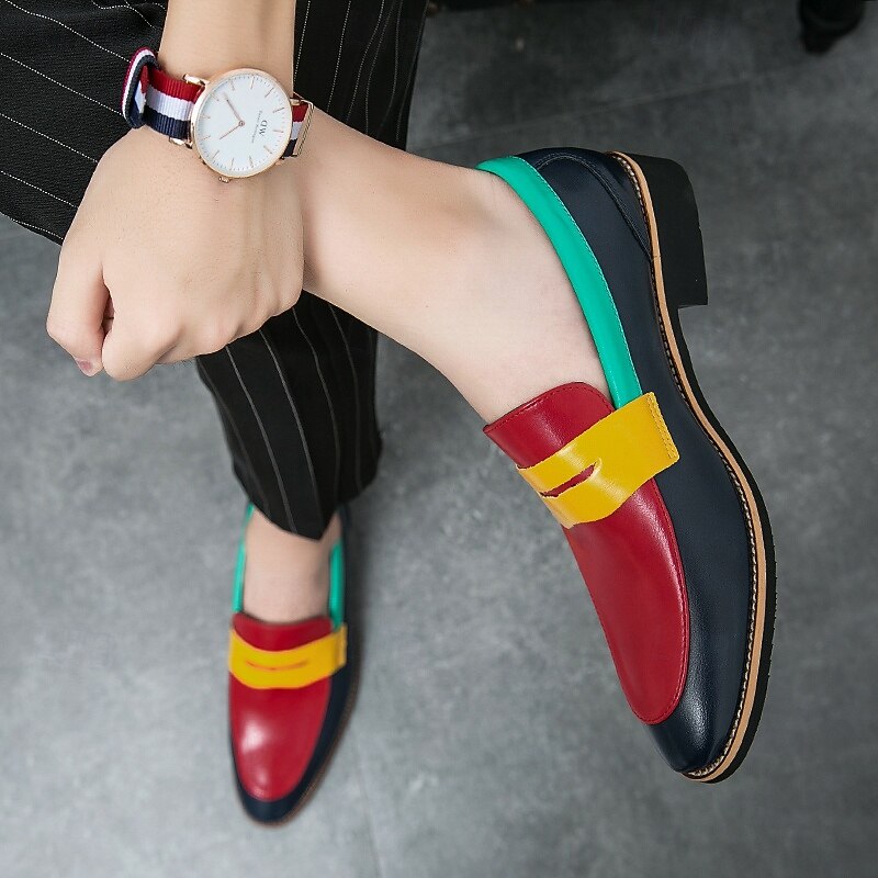 Highlights [Fabric] : Crafted from premium PU leather, these men's loafers offer a smooth texture and high durability, ensuring a comfortable experience with every wear. [Silhouette] : Designed in a classic round-toe slip-on style, these loafers provide a convenient and sleek fit that complements both casual and formal attire. [Design Highlights] : Featuring a vibrant color-block design, the loafers combine bold red on the toe cap, a yellow vamp, and deep blue sides with a teal green collar. This modern palette adds a fashionable edge to any outfit, while the durable rubber outsole enhances stability and comfort. [Occasions] : Perfect for a variety of occasions, these loafers transition seamlessly from casual outings to formal events. Whether you're headed to a weekend gathering or a business meeting, they make a stylish statement. [Size Range] : Available in a wide range of sizes, from US6-6.5 (EU38) to US12 (EU45), these loafers ensure a personalized fit for every gentleman seeking both style and comfort.