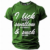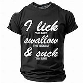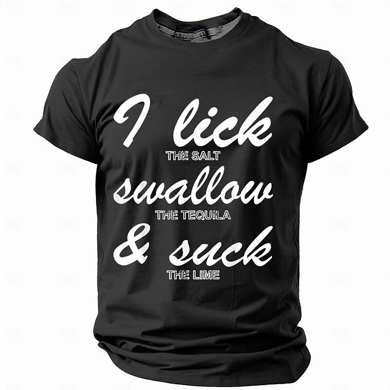 Highlights [Fabric] : Crafted from high-quality polyester, this T-shirt offers a balance of comfort and breathability, making it perfect for spring and summer wear. The material is not only soft but also lightweight, ensuring you stay cool in warmer climates. [Fit Type] : Designed with a regular fit, this T-shirt features a classic crew neck and short sleeves, suitable for various body types. Its micro-elasticity provides ease of movement while retaining shape, delivering an effortlessly relaxed style. [Design Highlights] : The T-shirt showcases a vibrant 3D print with a humorous slang graphic, "I lick the salt, swallow the tequila, & suck the lime," adding a playful and distinctive element to your wardrobe. The retro vintage aesthetic infuses your look with personality. [Occasions] : Perfect for sports, outdoor activities, holidays, and casual outings. Whether you're going out with friends or enjoying a day of relaxation, this T-shirt serves as a great conversation starter, effortlessly blending street style with casual vibes. [Size Range] : Available in a wide range of sizes, from S to XXXL, ensuring a comfortable fit for adult men across different body types.