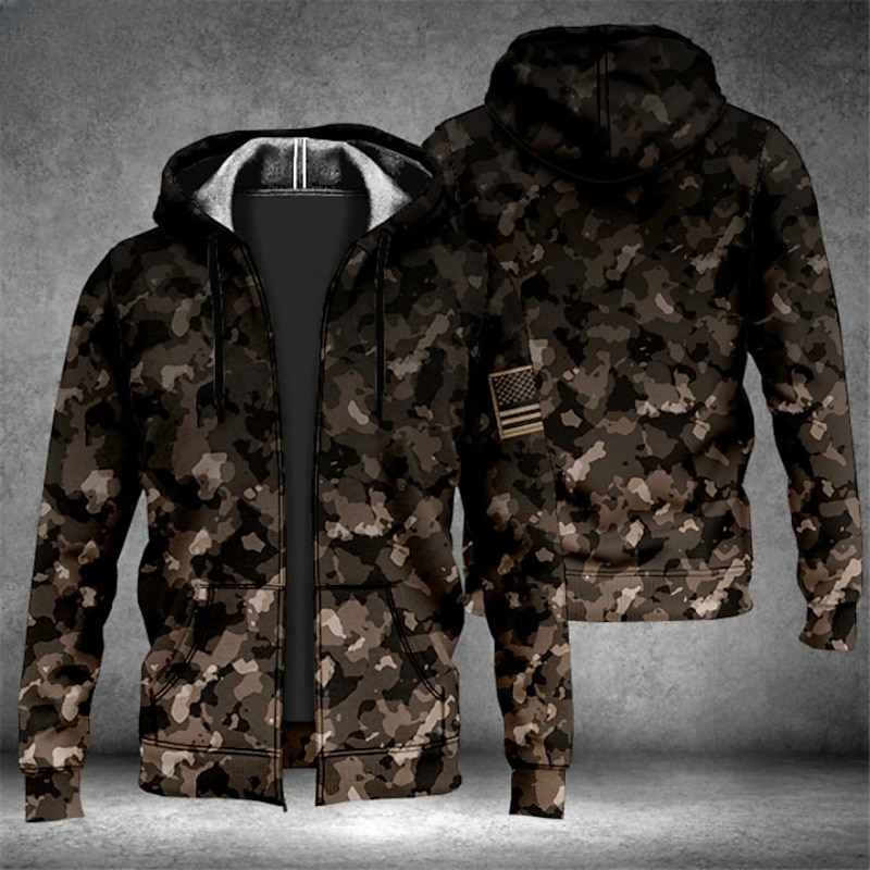 Highlights Hoodie Highlights [Fabric]: Crafted from a durable polyester blend, this hoodie offers a balance of comfort and warmth, making it ideal for casual outings and outdoor adventures. The micro-elastic nature of the fabric ensures a snug fit while allowing for ease of movement during various activities. [Fit]: Designed with a relaxed regular fit, this hoodie accommodates comfortable layering over other clothing, providing practicality and style for those who favor a laid-back look. [Design Highlights]: This zip-up hoodie features an eye-catching 3D camouflage graphic print. The design includes a full-length zipper for convenient wearing and removal, adjustable drawstrings on the hood for a custom fit, and a unique sleeve patch that adds a distinctive touch. Ribbed cuffs and hem enhance the fit, ensuring warmth retention. [Occasions]: Perfect for sports, outdoor activities, holidays, and daily casual wear, this versatile hoodie is suitable for various scenarios, offering both style and functionality. [Size Range]: Available in a wide range of sizes from S to 5XL, ensuring a suitable fit for different body types and preferences. With its designer appeal and practical features, this hoodie caters to those who appreciate modern streetwear.